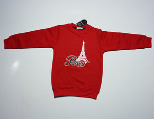 This adorable red sweatshirt featuring a chic “Paris” print is paired with soft black jogger pants — the perfect combo of comfort and fashion for both boys and girls.